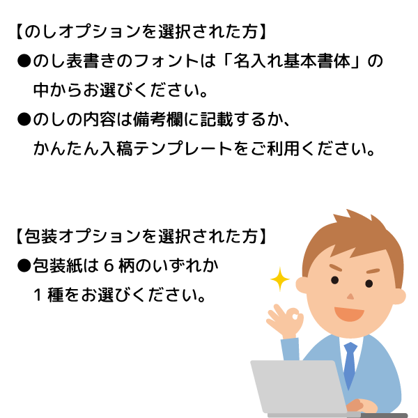 | 備考 | 【名入れ可能商品】 ※インクジェット印刷で500個以上のご注文をいただく場合は、納期が変わる可能性がございます。 2色印刷の場合は版代・印刷代が倍になります。ご希望の場合は備考欄にお書き添えください。 ・耐熱温度100℃ ※illustratorデータ入稿限定 デザインデータはillustrator(ベクターデータ)で作成し、Ai形式でご入稿ください。 illustratorをお持ちでない場合は、ご注文前にお問い合わせフォーム内の【データ添付を伴うお問い合わせ】の手順でお問い合わせください。 データの内容によっては別途書き起こし(有償)が必要となります。 のし巻きは200個から承ります。 200個未満をご希望の場合は一式15000円を頂戴します。 包装紙巻きは100個から承ります。 100個未満をご希望の場合は一式10000円頂戴します。 |