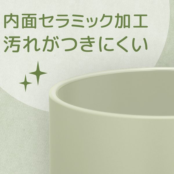 魔法瓶構造の為保温・保冷効果に優れ、飲み頃の温度を長い時間キープしてくれます。また飲み物本来の味や香りを損なわずに楽しむことができ、汚れが付きにくいセラミック加工が内側に施されています。