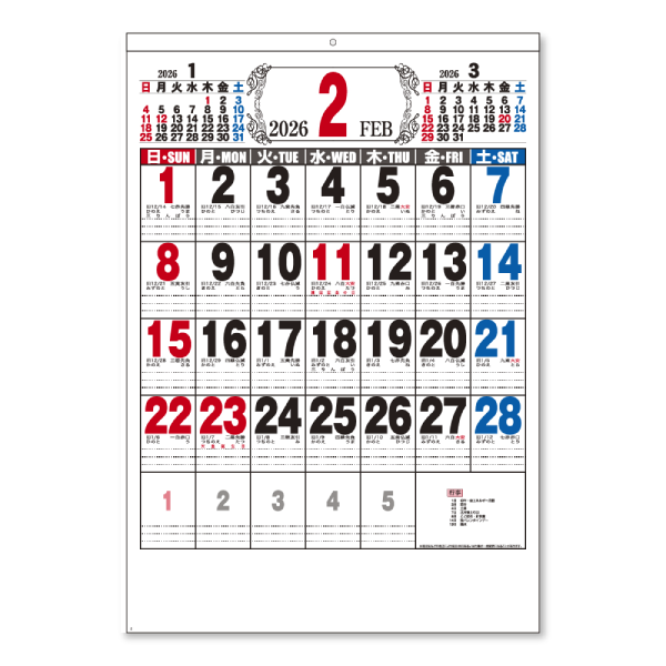 遠くからでもよく見える大きな文字と広いメモスペースが特徴の壁掛けカレンダー。 通常のものより一回り大きいA2サイズで使いやすさも兼ね備えています。環境にやさしいホットメルト製本で分別する必要なく廃棄できます。商品下部に名入れができますので、年末年始のご挨拶品としていかがでしょうか。