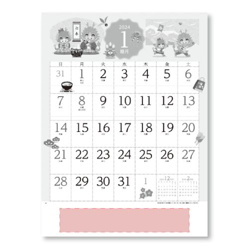 かわいい干支と、毎月の行事のイラストが楽しいほのぼのカレンダー。 メモスペースも広く実用性も抜群です。