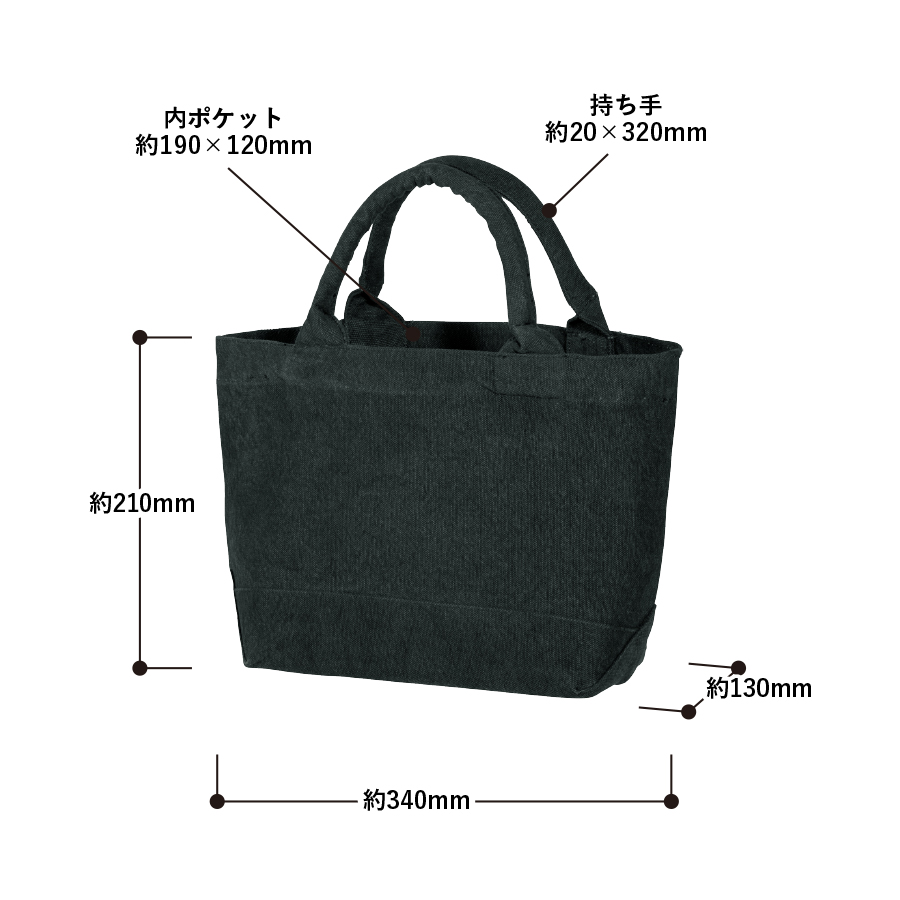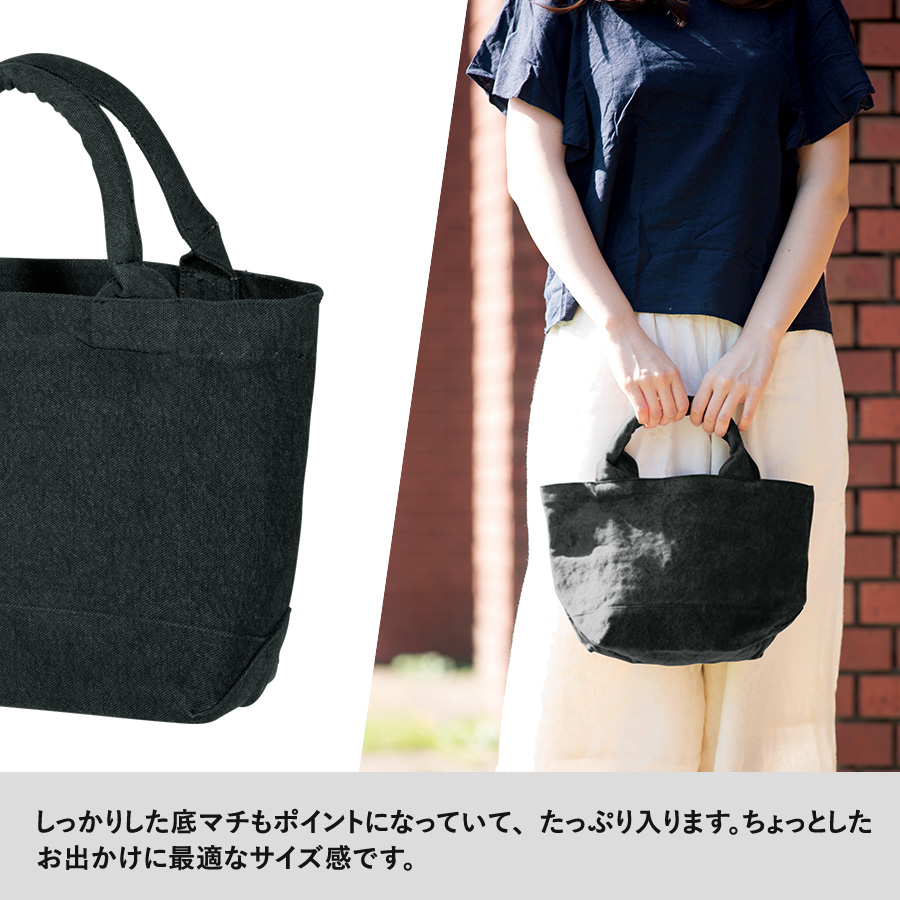 【小さ目のオリジナルバッグをお探しの方に!】カジュアルなパイプハンドルとしっかり底マチがポイントな、ちょっとした小物を入れるのに調度いいサイズのウォッシュキャンバストートです。くったりとした質感だけれどもしっかりの厚手生地と、便利な内ポケットも魅力的です。