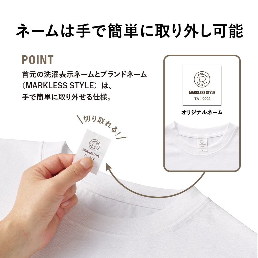 ネームは洗濯表示とブランドネームの二枚が首元にありますが、手で切り取れる素材になっております。