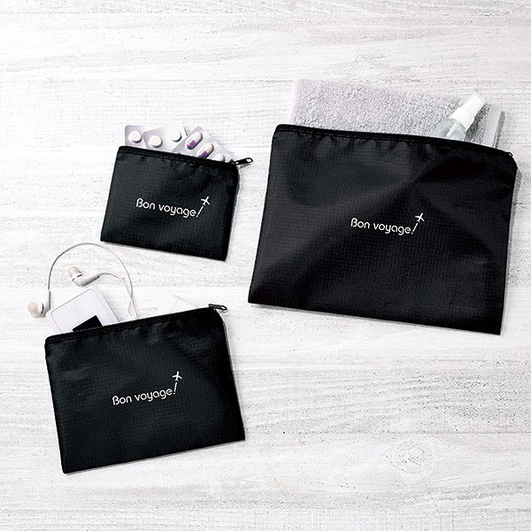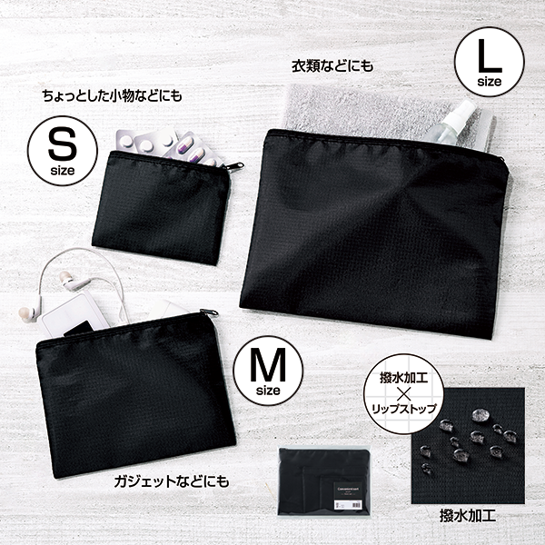 楽しく仕分けて、上手に活用! 不使用時は1つにまとめて収納できる、使いやすいシンプルな3サイズのリップストップ生地を使用したポーチです。 アイデア次第で様々な使い方ができる多機能性やおしゃれな見た目など、定番アイテムだからこそこだわりが見える一品を選びたいのがノベルティ。撥水加工された生地を使用していますので、アウトドアや旅行、美容、インテリアなど各種イベントの販促品として喜ばれる商品です。