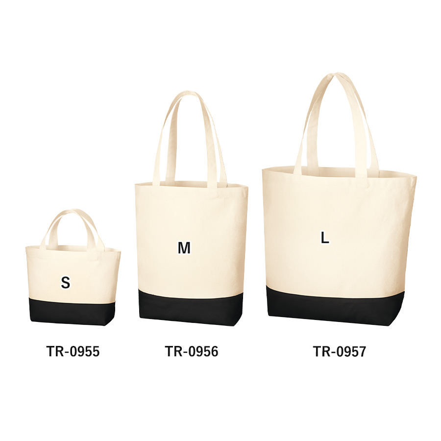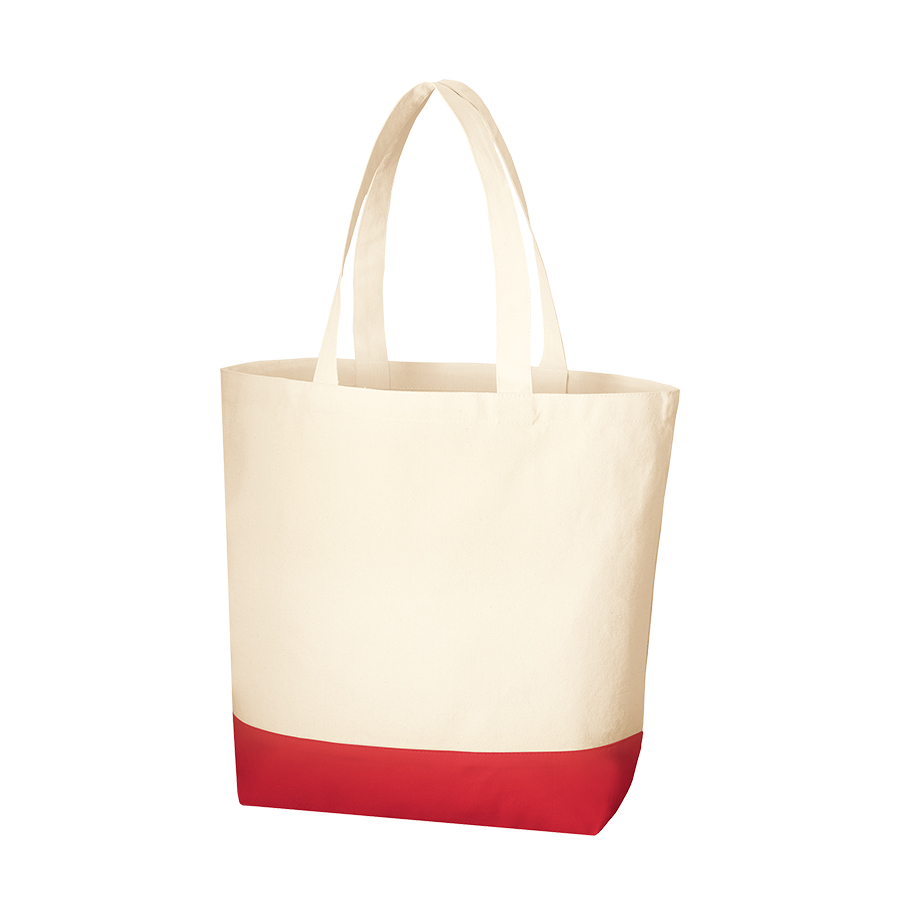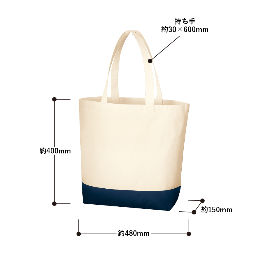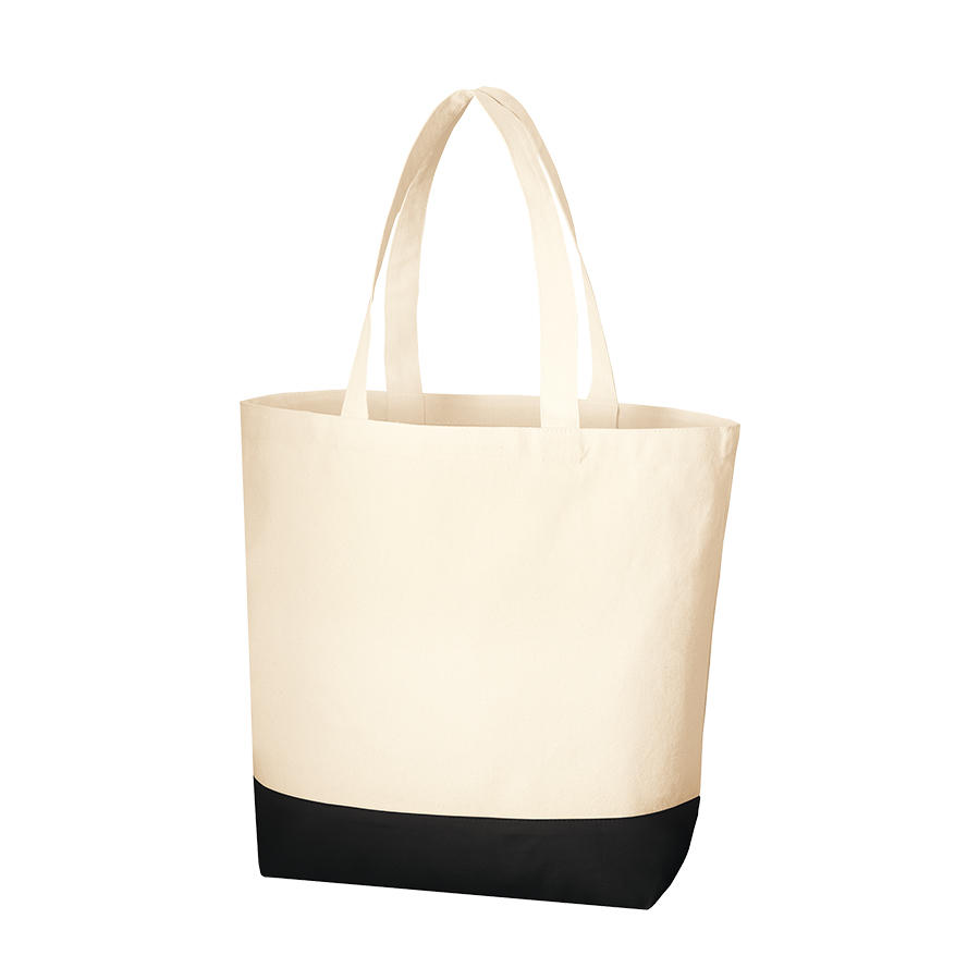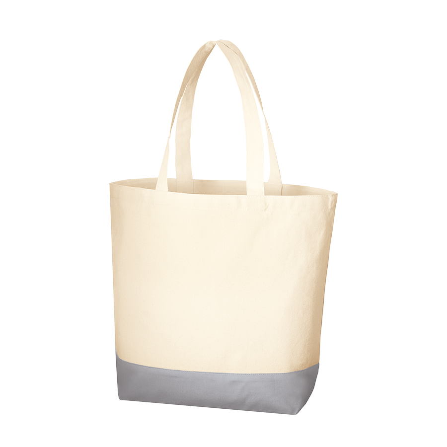 ボトム部分にカラーの切り替えがある、おしゃれなキャンバストートバッグです。持ち手部分のベルトが側面にありませんので、オリジナルデザインを大きく名入れすることができます。10オンスのキャンバス生地は丈夫なので、エコバッグやサブバッグにぴったり。底マチも広いので、かさばる荷物を入れるお買い物バッグにもおすすめです。ユニークなデザインを印刷して、ノベルティや販促品としてお渡しすれば、喜んで繰り返しお使いいただけるはずです。