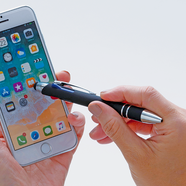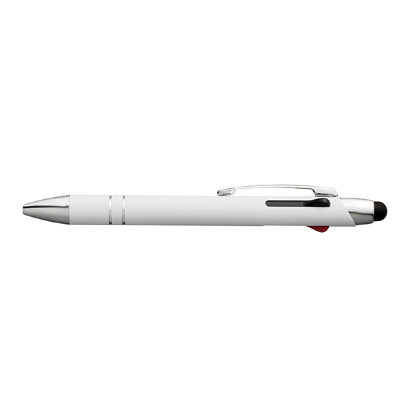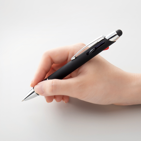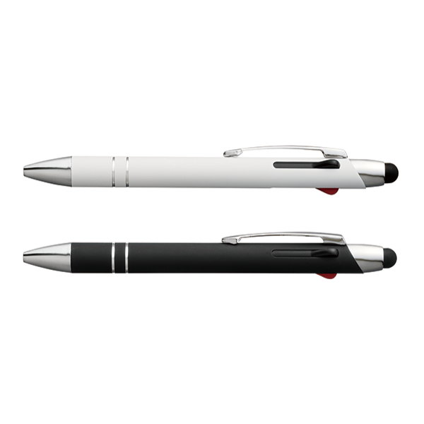 メタルの程よい重量感とラバー仕上げが手になじみやすく、黒・赤・青の3色ボールペンに加え、タッチペンとしての機能も備えた実用性の高い1本です。
