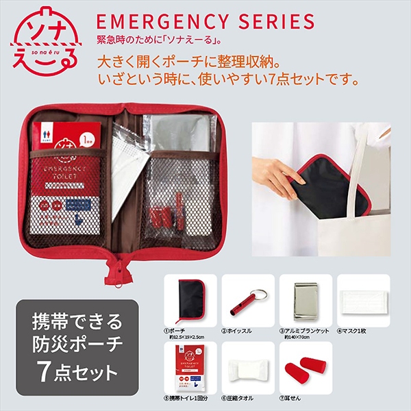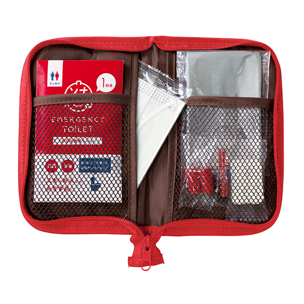 | 付属品 | マルチポーチ、携帯トイレ、圧縮タオル、アルミブランケット、不織布マスク、ホイッスル、耳栓 |