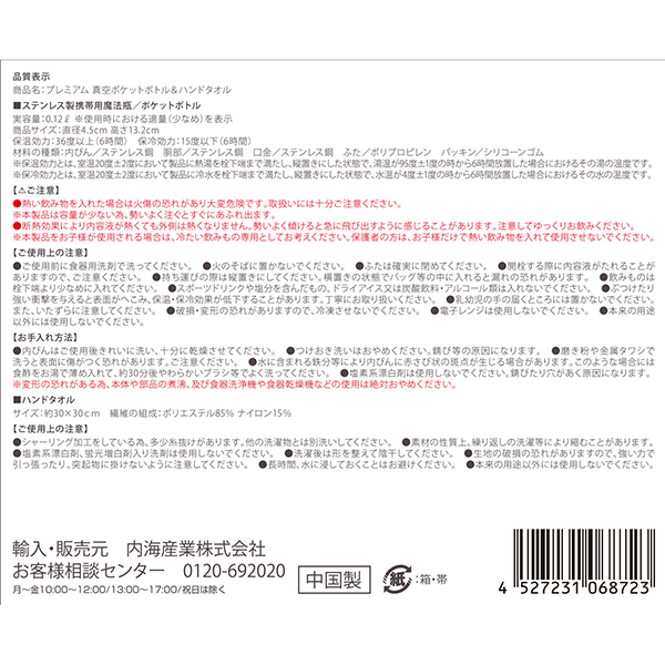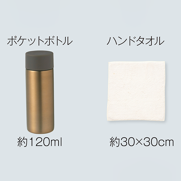 | 本体サイズ | ポケットボトル/φ45×132mm、ハンドタオル/約300×300mm |