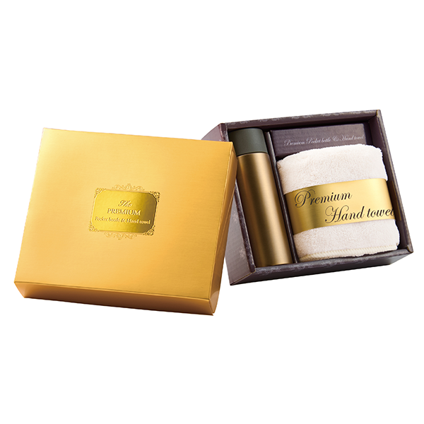 ゴールドパッケージに納めた、おでかけ時にセットで使えるミニボトルとハンドタオルのギフトセット。