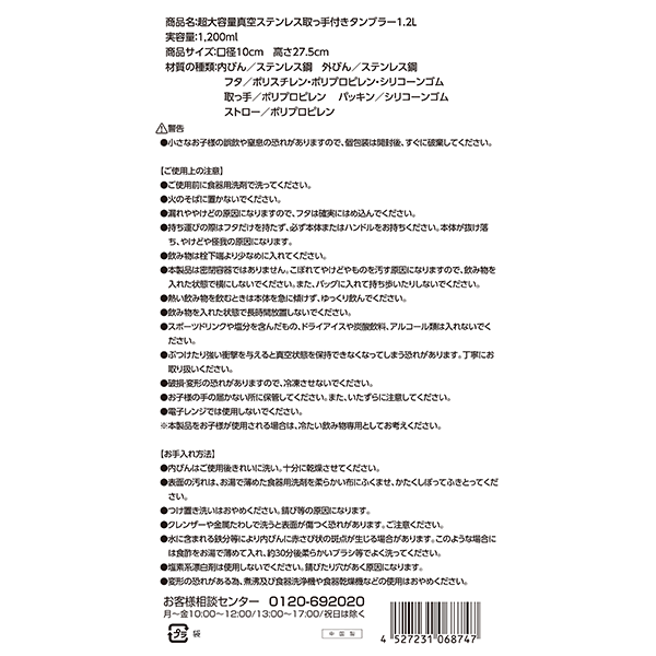 | 素材 | 内びん/ステンレス鋼 外びん/ステンレス鋼、フタ/ポリスチレン・ポリプロピレン・シリコーンゴム、取っ手/ポリプロピレン、パッキン/シリコーンゴム、ストロー/ポリプロピレン |