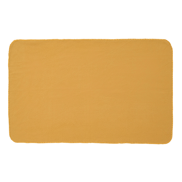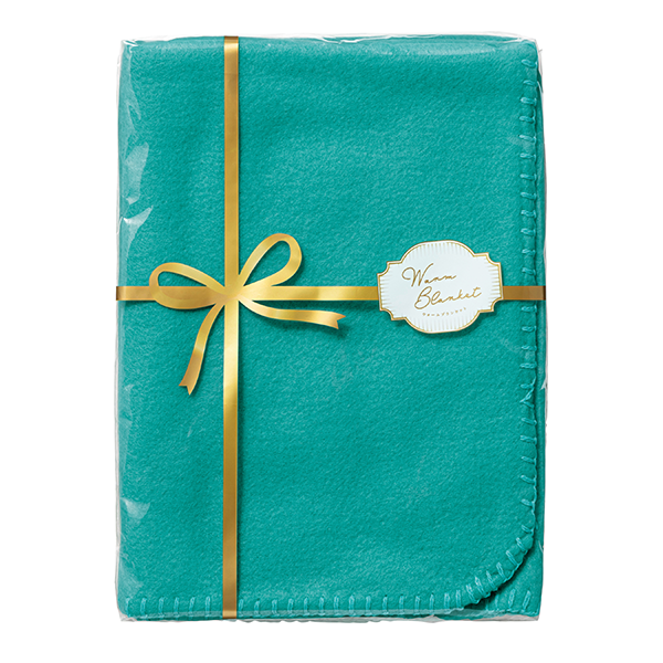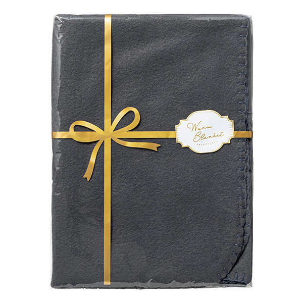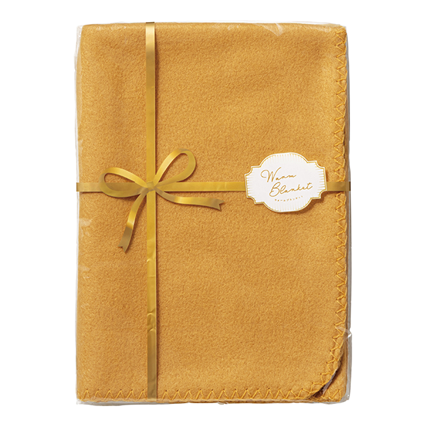 ゴールドのリボンでラッピングしたかのようなパッケージがポイント。使いやすいフリースブランケットです。