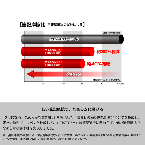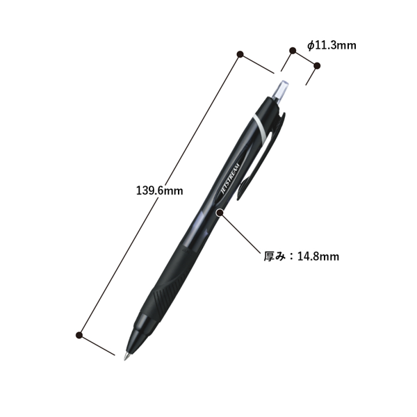 圧倒的な人気を誇るJETSTREAMの一番スタンダードな単色ボールペンです。 超・低摩擦「ジェットストリームインク」を搭載しており、従来の油性ボールペンに比べて筆記抵抗が大幅に軽減。なめらかでくっきりと濃い線が書けることで定評があります。
