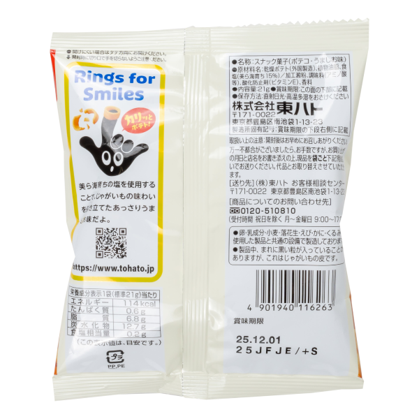 香ばしいじゃがいもの風味とカリッと軽快な食感がクセになる味わいで、性別や年齢を問わず幅広く喜ばれます。パッケージラベルは全面オリジナル印刷が可能で、企業ロゴやキャンペーン情報などのPR要素をしっかり盛り込める広いスペースを確保。知名度のあるお菓子という安心感もあり、展示会やイベント、街頭配布など多彩なシーンで活用しやすい商品です。