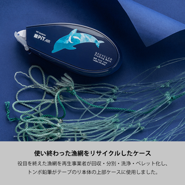 7月末までの限定特価!再生業者とトンボ鉛筆の協業で、役目を終えた漁網がテープのりのケースとして生まれ変わりました。 ピットエアーは軽やかな引き心地と静音設計が特徴のテープのりです。のりは「パワーネットテープ」と呼ばれる独自の形状で吸着力も抜群。完成品はバイオマスOPP袋に入れるため、梱包までエコな商品です。