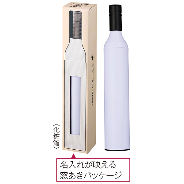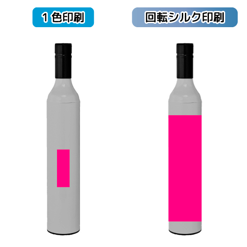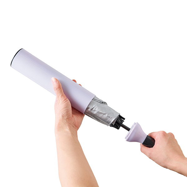 まるでワインボトルのような形のスタイリッシュなハードケースに入った晴雨兼用傘です。 まずその見た目のインパクトと意外性が会話のフックになり、さらに回転シルクで大胆にデザインを施せばおしゃれなギフトになります。濡れた傘でもこのケースに納めてしまえばバッグに入れても安心、という機能面でもメリットの大きいアイテムです。
