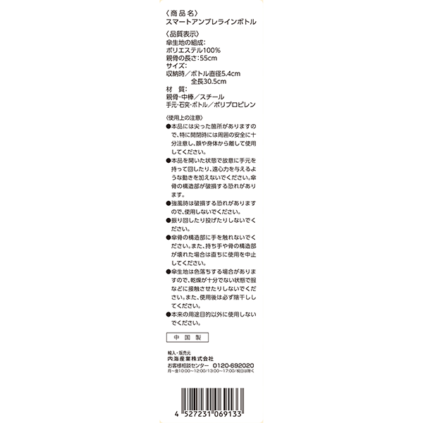| 素材 | 生地/ポリエステル、親骨・中棒/スチール、手元・石突・ボトル/ポリプロピレン |