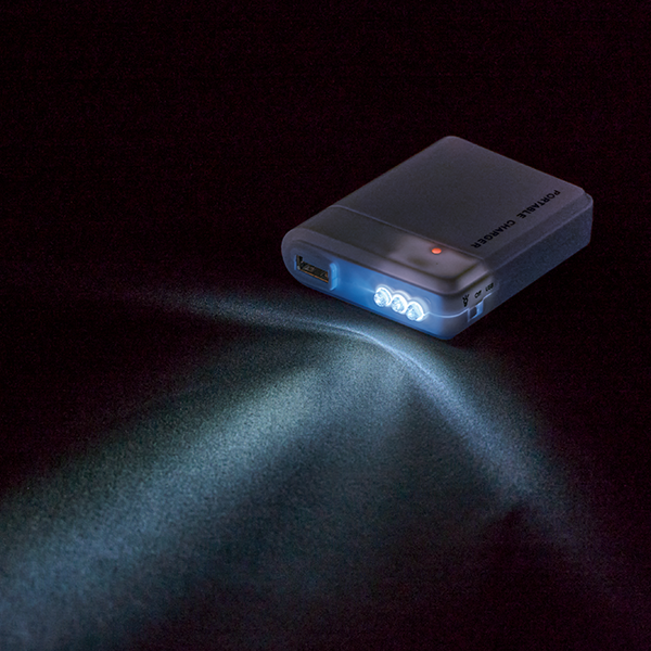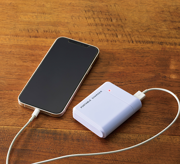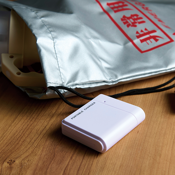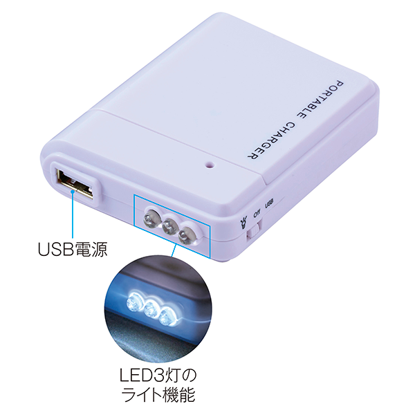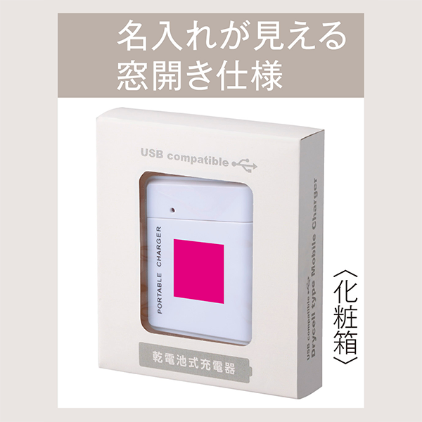 フルカラー印刷が際立つホワイトボディーのモバイルバッテリー。停電時も心強い乾電池式。 単3型乾電池4本で充電可能になります。LEDライト付きなので、緊急時に手元を照らすのにも便利です。一般的なモバイルバッテリーはそれ自体の充電が必要ですが、乾電池式は急な停電時にも安心。また、窓空きパッケージは名入れが映え、防災グッズとしてだけでなく企業や店舗のオリジナルノベルティや販促品として活用できます。
