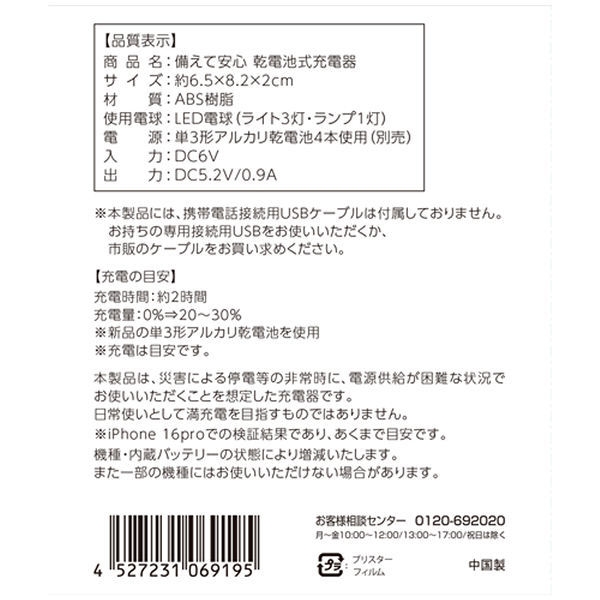 | 備考 | 【名入れ可能商品】 単3形アルカリ乾電池4本使用(別売) 入力:DC6V 出力:DC5.2V/0.9A |