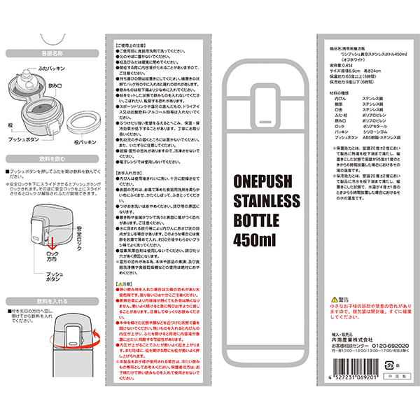 片手で開けられるワンプッシュオープン式のシンプル&スタイリッシュなステンレスボトル。 読書しながら、スマホを見ながらでも片手でポンッと楽々オープン♪入れたてキープの真空二重構造です。車のドリンクホルダーにもすっぽり収まるので、蓋をしておけば急な振動に零れることもなく、停車中にはさっと喉を潤すことも出来ます。