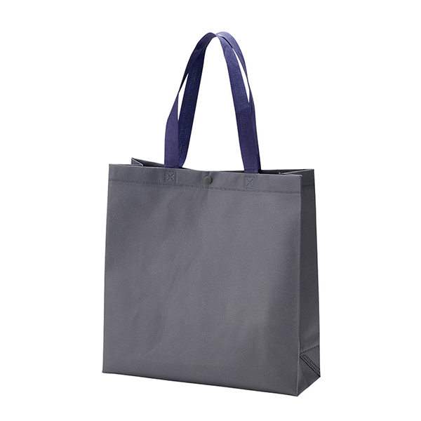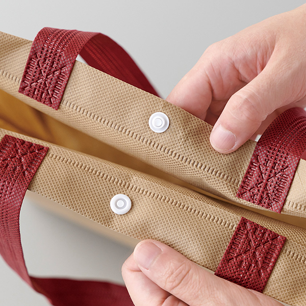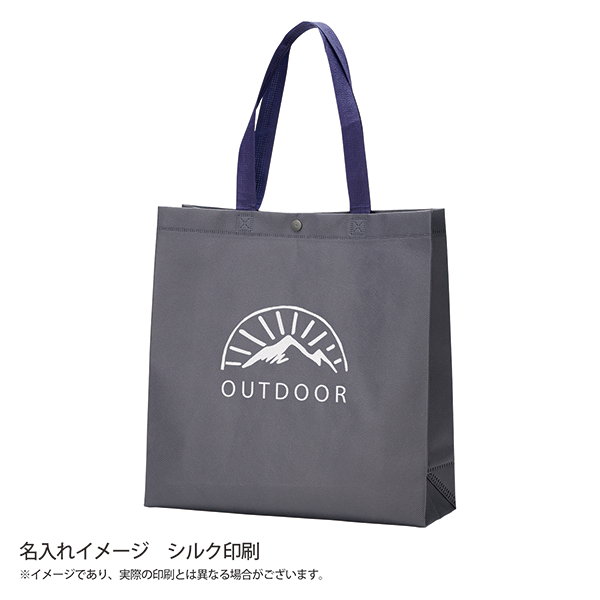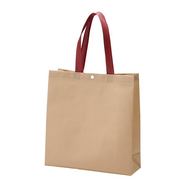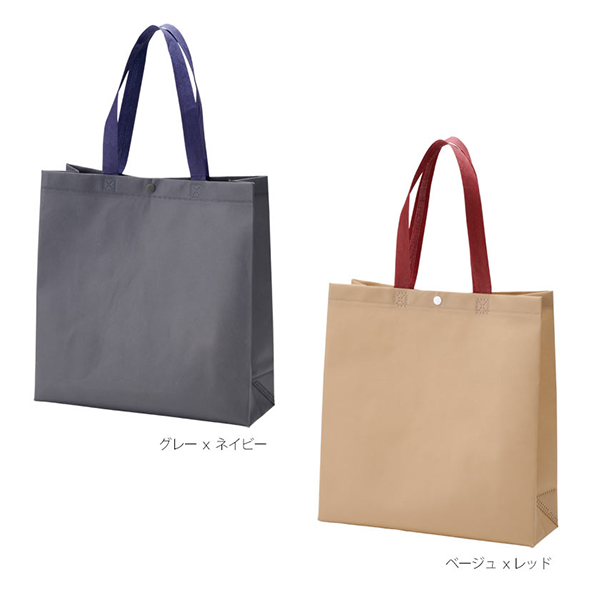 たっぷり収納!持ち手の色が違うオシャレなツートンカラーで、肩掛けできる不織布バッグです。 ボタン付きで中身の飛び出しを防ぎます。セミナーの資料配布や展示イベントなどでノベルティを入れるのにぴったりなサイズ感で喜ばれること間違いなしです。