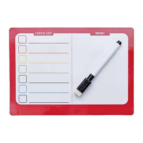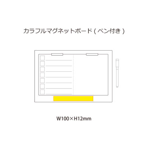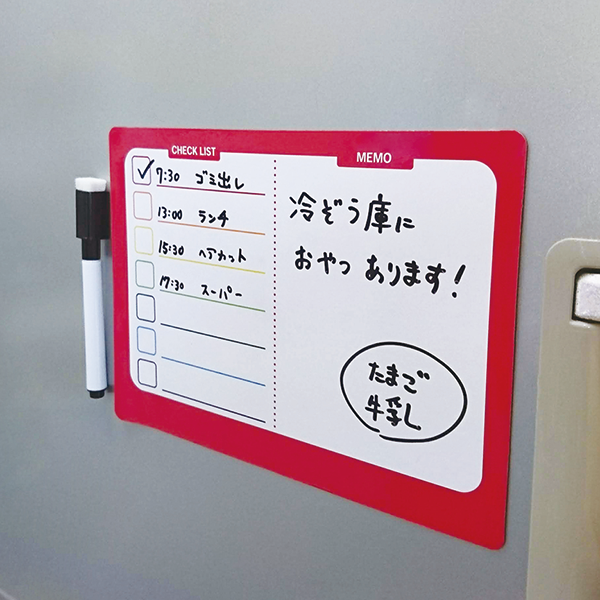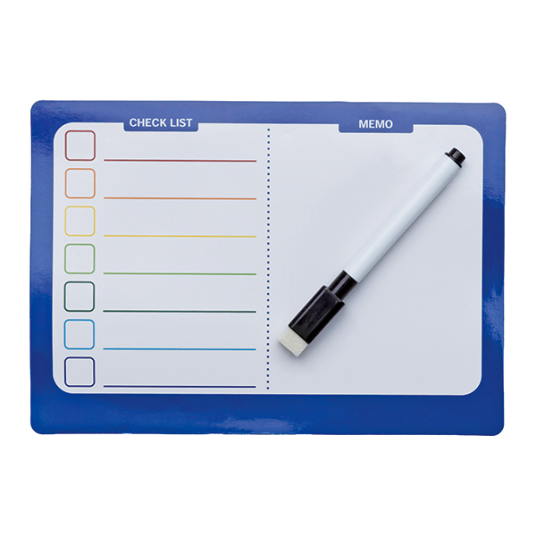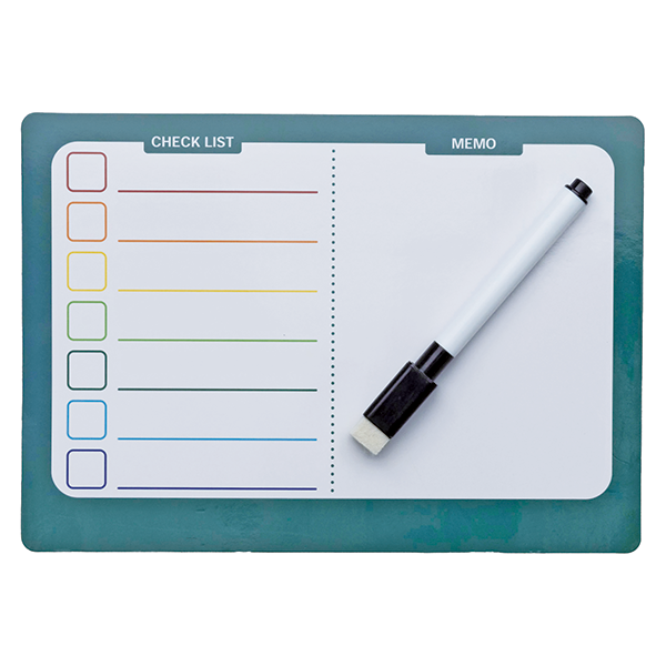 カラフルでお洒落なマグネットボードです。 ペン付きですぐ使えるのも嬉しいポイント。左スペースはチェックリストになっているので、ToDoリストや1週間の予定表として使えます。右スペースは自由に書き込みが出来るフリースペース。買い物のメモや伝言、お絵かきにも使えるスペースです。リビング・キッチン・子ども部屋などで伝言板として幅広く活躍します。