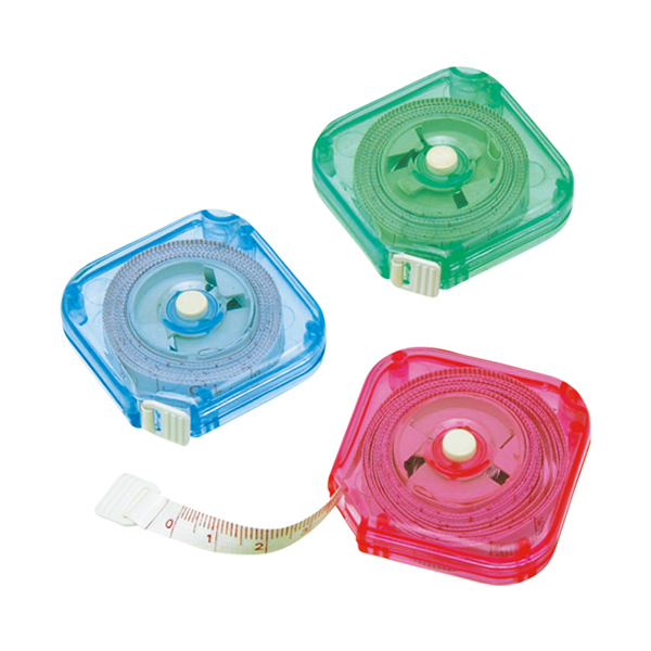 キャンディカラーのスケルトンボディが可愛らしいメジャーです。 引き出したり戻したりする時に中身がくるくる見えるのもキュート。メジャーは1.5mあり、柔らかく扱いやすい布製です。安価で名入れもしやすいアイテムのため、バラマキノベルティとして大量配布にオススメです。