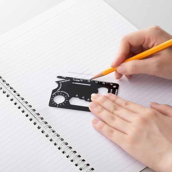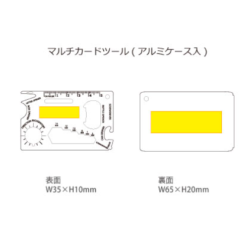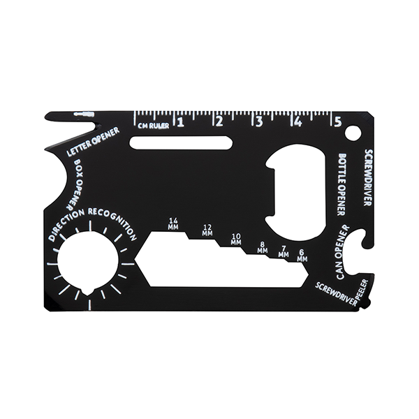 ずっしりしたアルミ製なのに薄くて便利!オープナーやドライバー、ルーラーなど14個の機能が付いた有能すぎるマルチカードツールです。 薄型カードサイズなので、財布やポケットなどにも収納可能。キーホルダーとしてバッグなどに付けられるキーチェーンも付属しています。定番品とはひと味違ったご挨拶ノベルティとして人気の高い商品です。