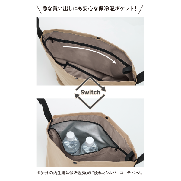 柔らかいコットンのような生地を使用したショルダーバッグです。 普段使いで使えるおしゃれなシルエットが魅力です。ファスナーを開けると保冷温ポケットが出てくるため、急な買い出しにも大活躍します。