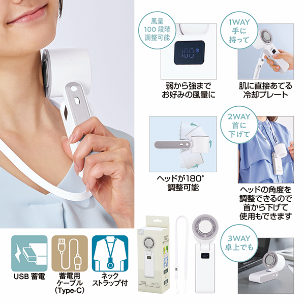 冷却プレートでひんやり+100段階風量調整で涼感。卓上、首掛け、ハンディの3WAYで使えるハンディファンです。 不使用時は折りたためばコンパクトになるので持ち運びも楽々。冷却プレート付きなので猛暑日もパワフルに冷風を送ります。夏に人気の販促アイテムだからこそ、利便性の高いものを選んで印象に残るノベルティに。
