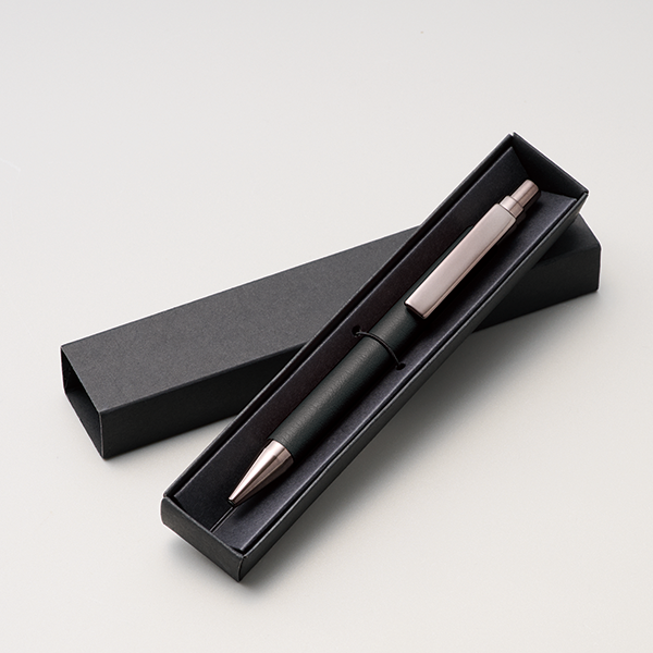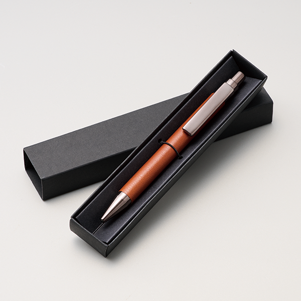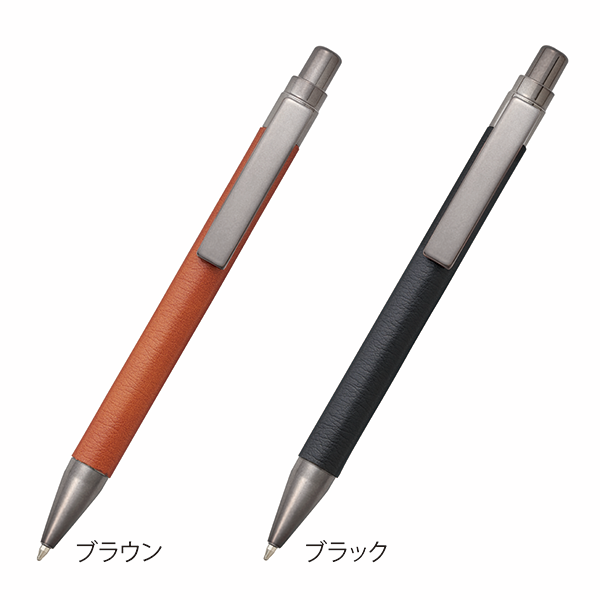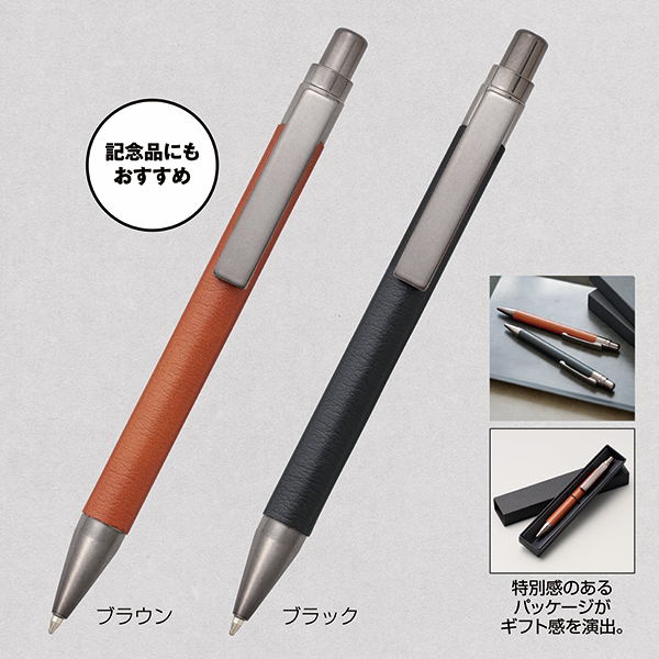 本体のボディ部分に合皮を使用し、高級感ある上質な質感を再現したボールペン。 ビジネスでもプライベートでも使用頻度の多いアイテムは、年齢や性別問わず喜ばれる実用性が魅力。セミナーや企業説明会などのノベルティや、周年記念イベントなどのメモリアルアイテムにおすすめです。