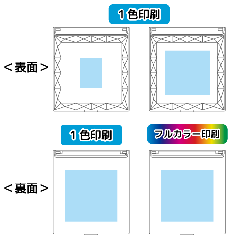 | 1色印刷範囲 | 正面(小)/W30×H40mm(1~2色)、正面(大)/W60×H60mm、裏面/W70×H70mm |