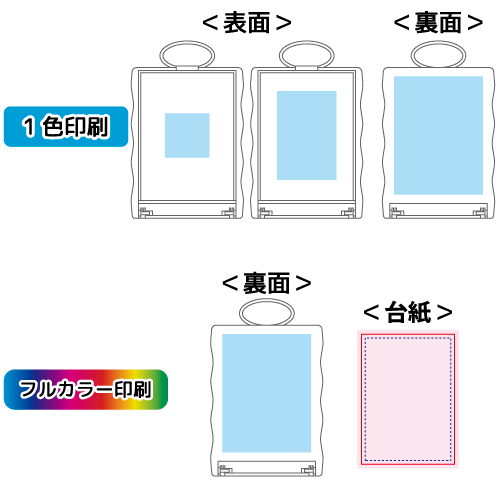 | 1色印刷範囲 | 正面(小)/W30×H30mm(1~2色)、正面(大)/W40×H60mm、裏面/W45×H60mm |