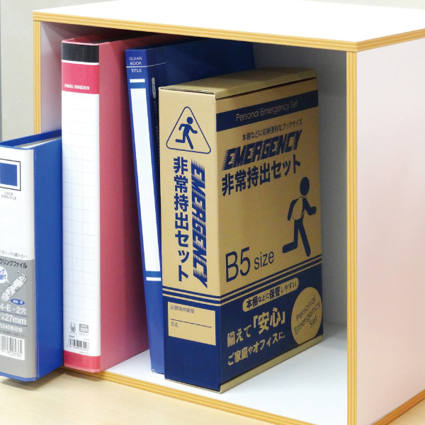 本棚や引き出しに立てて収納できる便利な防災セットです。