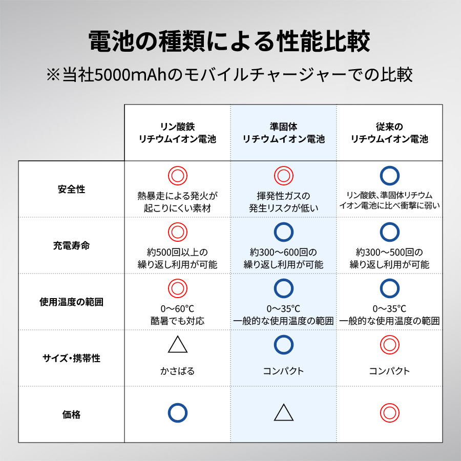 耐寒・耐暑性が高く、また電解液がゲル状なことでガスが一気に出にくいため、発火リスクが低くなっています。