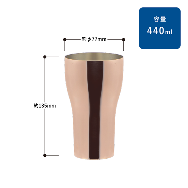 燕商工会議所による認定を受けた「メイド・イン・ツバメ」シリーズの純銅タンブラー。 素材の魅力を活かした高級感のある仕上がりで、上質な記念品をお探しの場面に適しています。440mlのたっぷり使える容量で、ビールやアイスドリンク用にもぴったり。周年記念やキャンペーンの特別景品としていかがでしょうか。