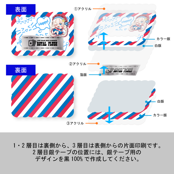 銀テープのデザインを再現したプレートを組み込むことで公演ごとの限定グッズとして展開できます。銀テープを入手できなかった来場者や、銀テープを使用しないイベントへの「参戦証明グッズ」としてもおすすめです。