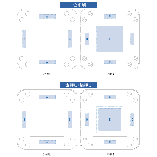 | 素押し・箔押し印刷範囲 | A/W45×H10mm、B/W10×H45mm、C/W32×H10mm、D/W10×H32mm、E/W60×H60mm |
