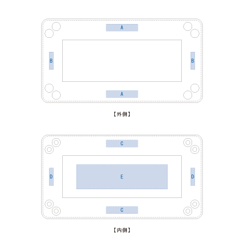 | 1色印刷範囲 | A/W45×H10mm、B/W6×H25mm、C/W45×H10mm、D/W6×H25mm、E/W130×H35mm |