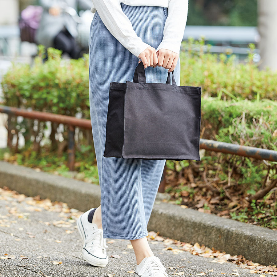 9色展開が魅力的な厚みのあるコットン生地のスクエアトートです。A4サイズが収容可能で企業用ノベルティや個人利用など幅広い用途にご利用いただけます。