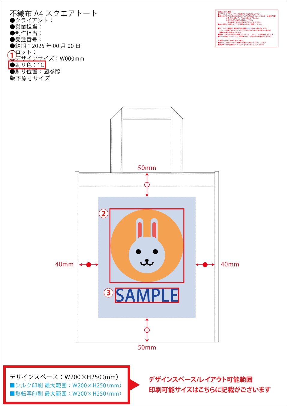 商品ページ内の印刷可能範囲画像や商品仕様をご確認ください。