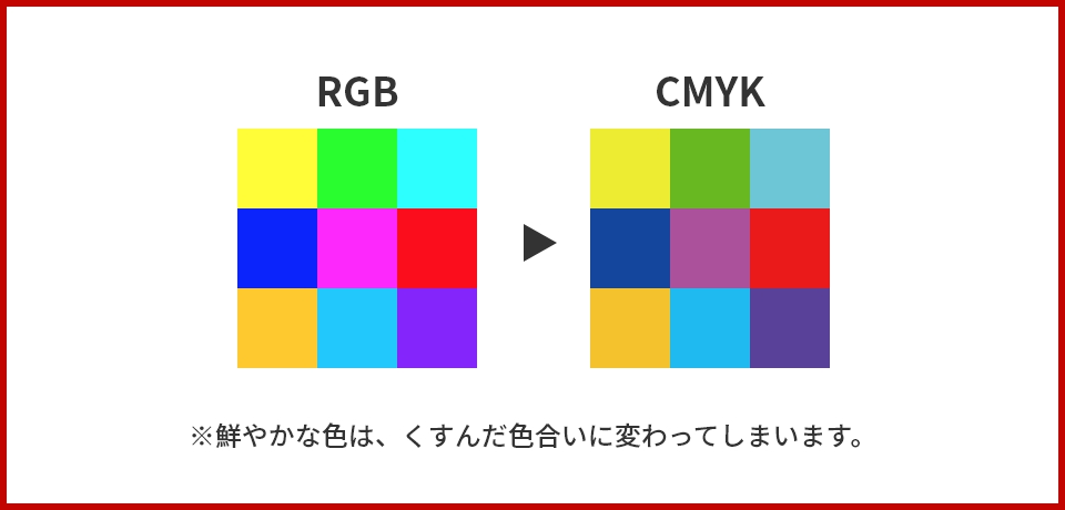 フルカラー印刷はCMYKで印刷するため、RGBのデータは印刷時に色味が変わります。