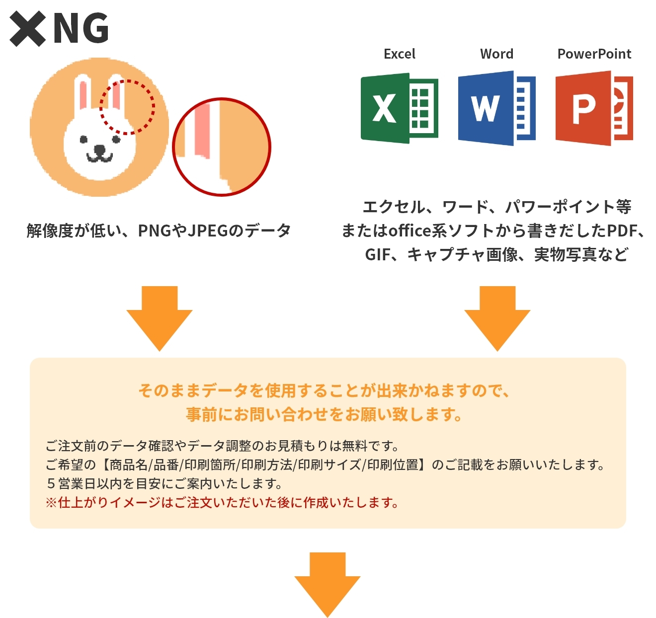 画像を貼り付けただけのものや、文書やイラストをスキャンしただけのもの、WordやPowerPointなどのOfficeソフトで作成したPDFは、入稿データとして使用できません。
